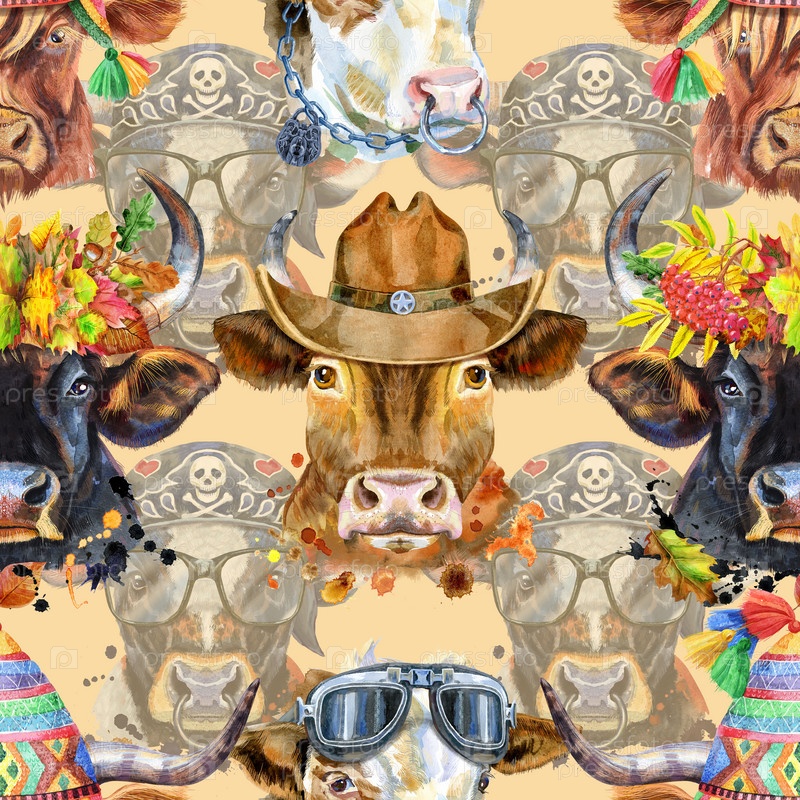 Акварельная графика быка. Бесшовный узор. Иллюстрация животного быка с всплеском акварельного текстурированного фона