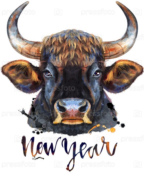 Бык с надписью Новый год. Акварельная графика. Бык животных иллюстрации с брызгами акварель текстурированный фон
