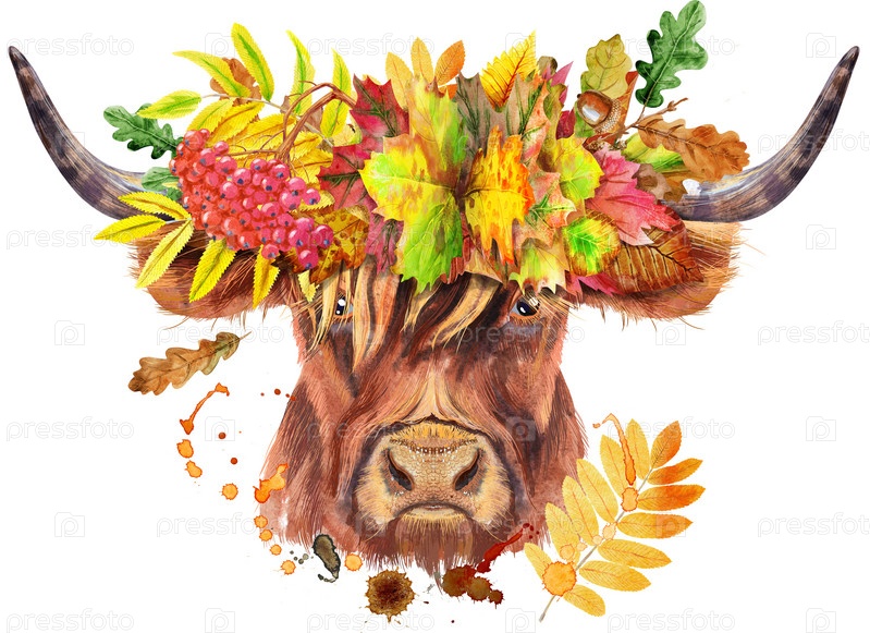 Акварельная иллюстрация коричневого быка с длинными рогами в венке из осенних листьев