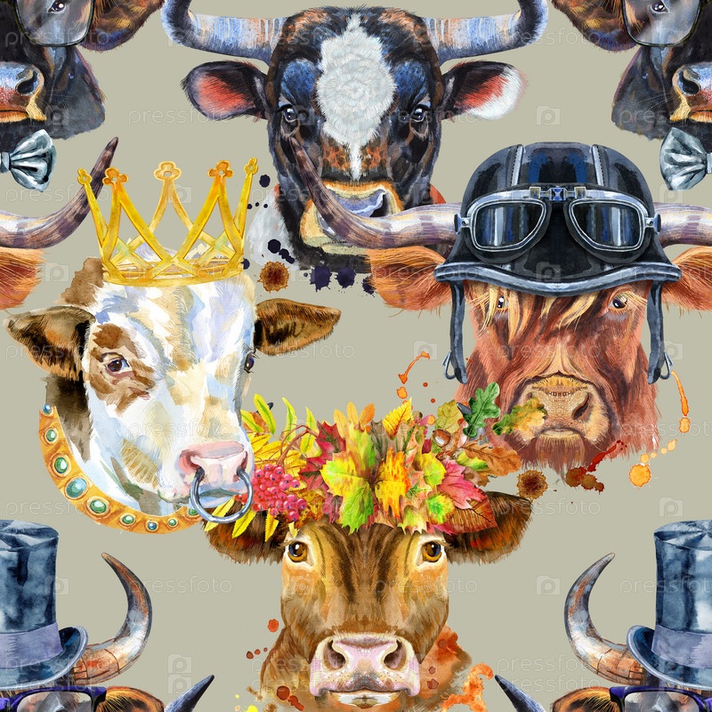 Акварельная графика быка. Бесшовный узор. Иллюстрация животного быка с всплеском акварельного текстурированного фона