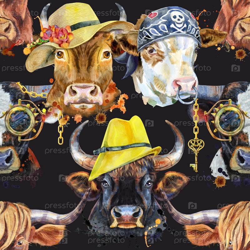 Акварельная графика быка. Бесшовный узор. Иллюстрация животного быка с всплеском акварельного текстурированного фона
