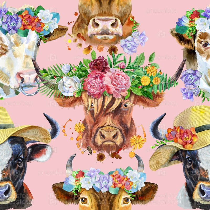 Акварельная графика быка. Бесшовный узор. Иллюстрация животного быка с всплеском акварельного текстурированного фона