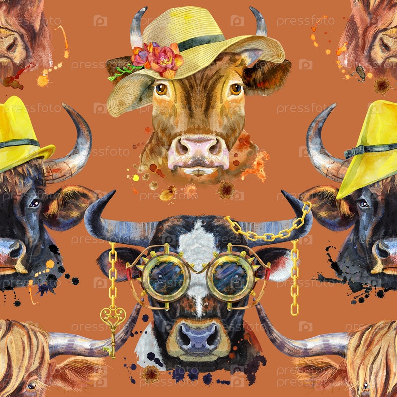 Акварельная графика быка. Бесшовный узор. Иллюстрация животного быка с всплеском акварельного текстурированного фона