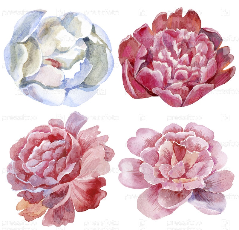Набор акварельных пионов. Винтажные цветочные элементы с пионскими цветами и листьями на белом фоне. Нарисованный от руки