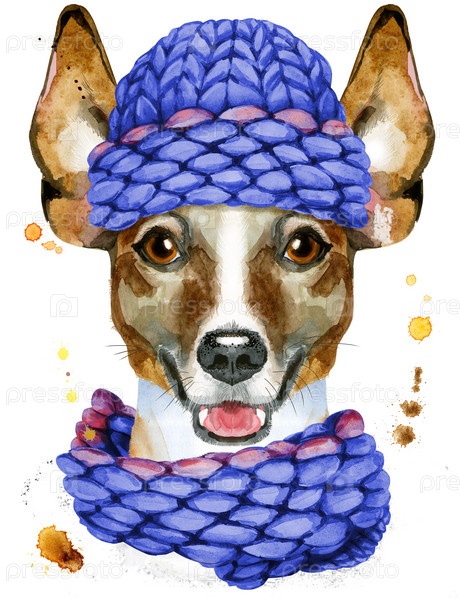 Симпатичная собака в синей вязаной шапке. Графика на футболках с собаками. акварель джек рассел терьер иллюстрация