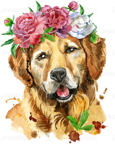 Акварельный портрет золотистого ретривера с цветком