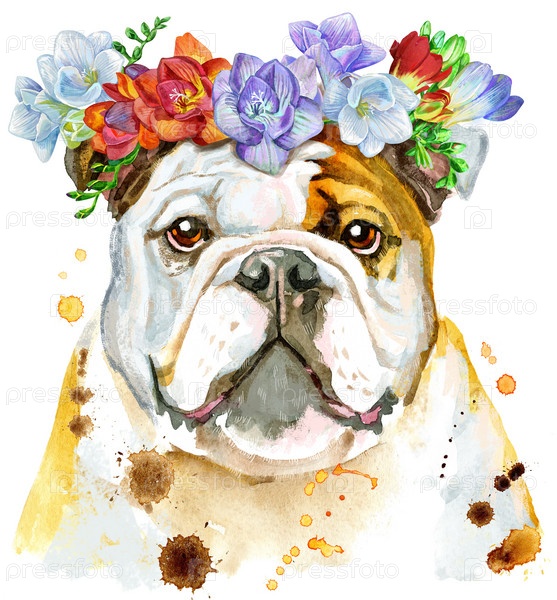 Акварельный портрет бульдога с венком из фрезии