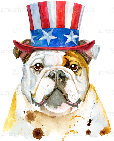 Забавный бульдог на День Независимости. Графика на футболках с собаками. акварельная иллюстрация собаки