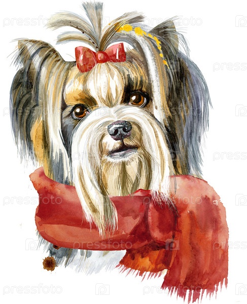 Акварельный портрет собаки породы йоркширский терьер с красным шарфом