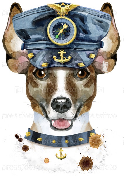 Акварельный портрет джек-рассел-терьера в ошейнике и кожаной кепке с якорем