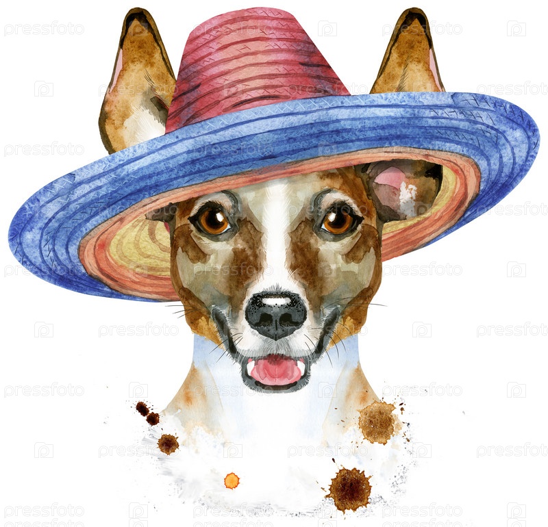 Симпатичная собака в мексиканской шляпе. Графика на футболках с собаками. акварель джек рассел терьер иллюстрация