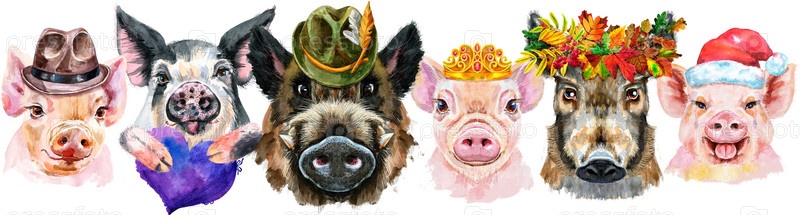 Бордюр из свиней. Акварельные портреты свиней и кабанов
