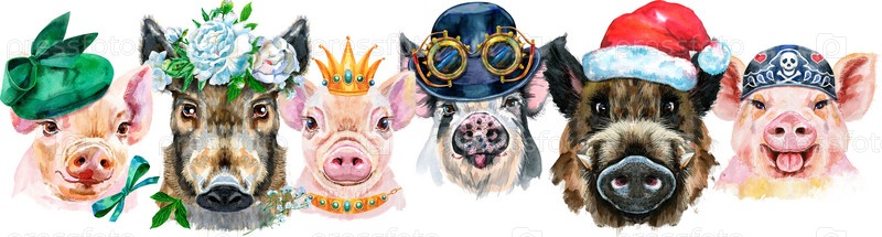 Бордюр из свиней. Акварельные портреты свиней и кабанов
