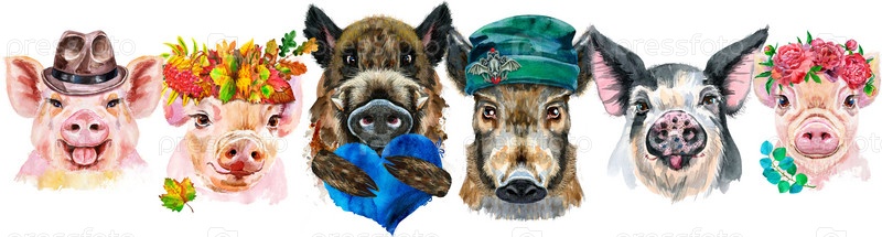 Бордюр из свиней. Акварельные портреты свиней и кабанов