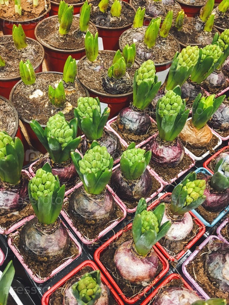 Саженцы красочных гиацинтов в горшках. Весенние распродажи в торговых центрах и цветочных магазинах. Цветущие растения для любителей ботаники