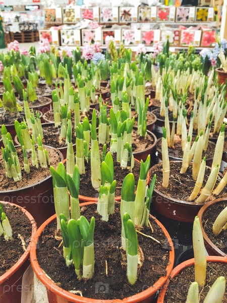 Саженцы красочных нарциссов в горшках. Весенние распродажи в торговых центрах и цветочных магазинах. Цветущие растения для любителей ботаники