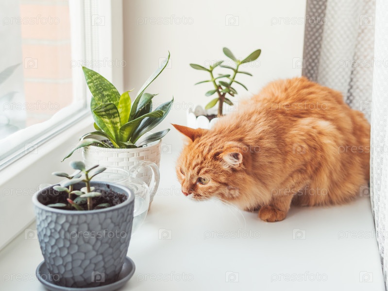 Милый рыжий кот нюхает комнатные растения. Цветочные горшки с крассулами и сансевиериями. Пушистый питомец нюхает сочные растения на белом подоконнике. Мирное ботаническое хобби. Садоводство дома