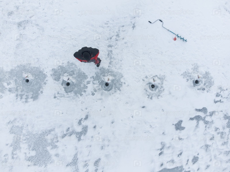 Рыбак на зимней рыбалке. Несколько лунок во льду