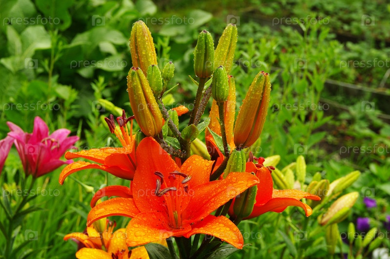 Красивые цветущие оранжевые лилии с каплями воды на лепестках после дождя под ярким летним солнцем