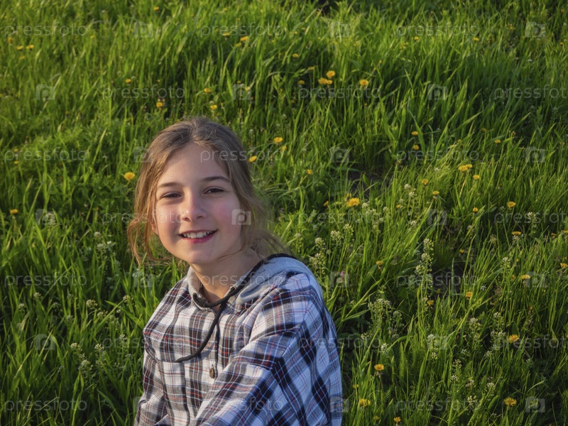 Улыбающаяся девочка-подросток на прогулке в парке сидит на цветущем зеленом лугу на солнце