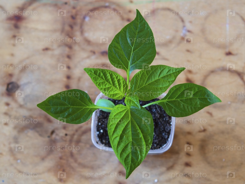 Небольшой куст перца в горшке, вид сверху