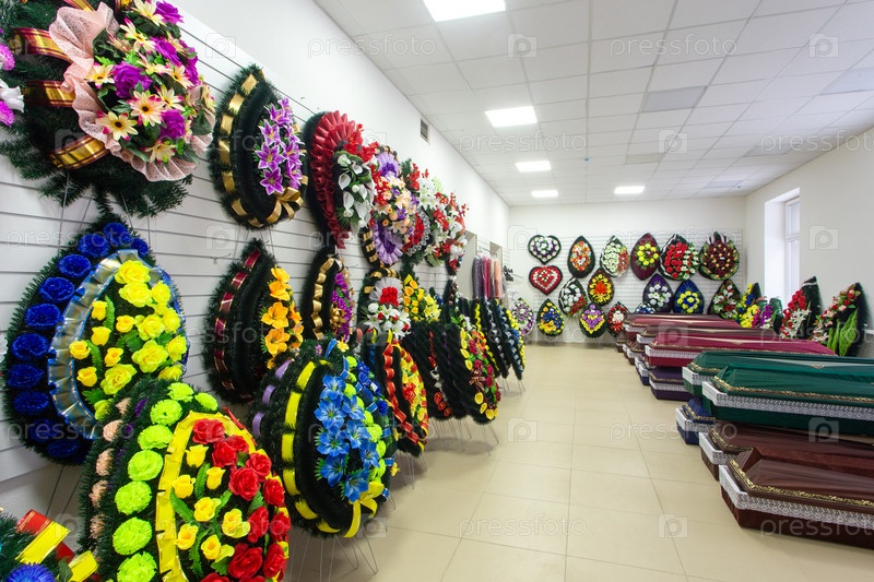 Интерьер комнаты с похоронными принадлежностями. Магазин по продаже гробов, похоронных венков и цветов