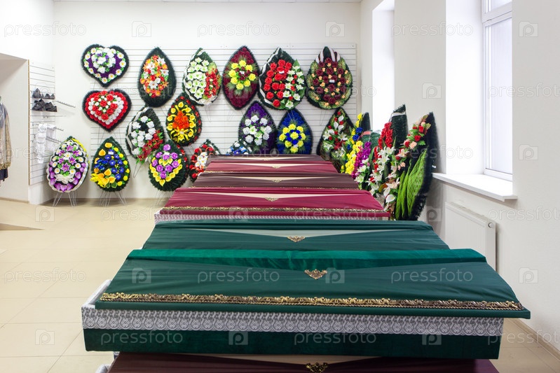 Интерьер комнаты с похоронными принадлежностями. Магазин по продаже гробов, похоронных венков и цветов