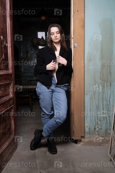 Молодая красивая женщина позирует в черной куртке и джинсах в квартире