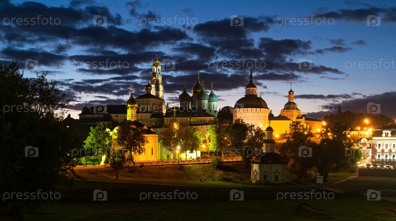 Сергиев Посад, Россия. Вечерний вид Троице-Сергиевой Лавры с иллюминацией