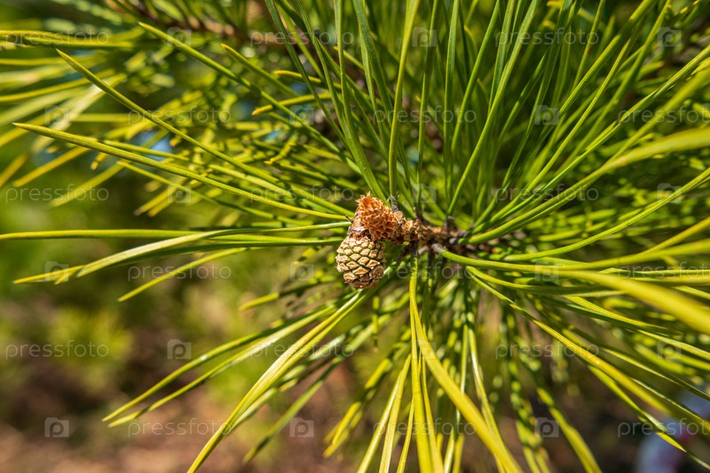 Маленький свежий конус на ветке в крупном плане. Длинная зеленая игла обыкновенной сосны (pinus silvestris)