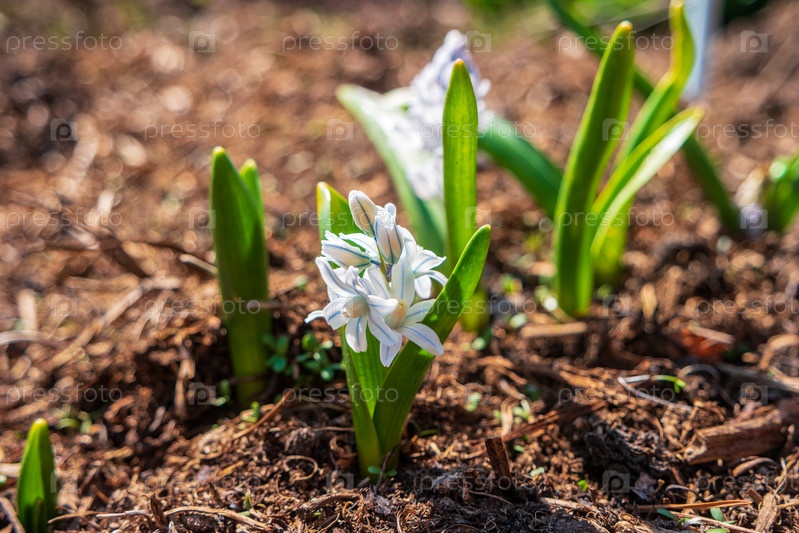 Пушкиния весенняя примула в саду. Цветущие цветы и нераспустившиеся бутоны растения