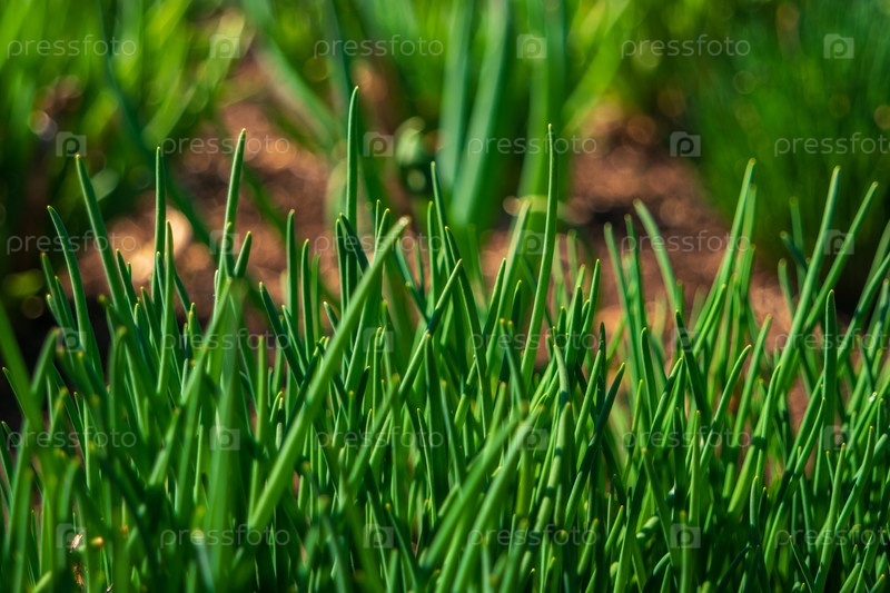 Вид на зеленый лук Шнитт в саду. Мягкий фокус на свежих побегах растения с размытым фоном абстрактной природы