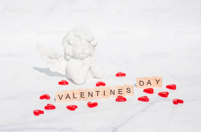 Слово «День святого Валентина» и милый ангел на белом мраморном фоне. Любовь на деревянных кубиках. Тема любви. День святого Валентина. Деревянные блоки со словом любовь. Положительные эмоции