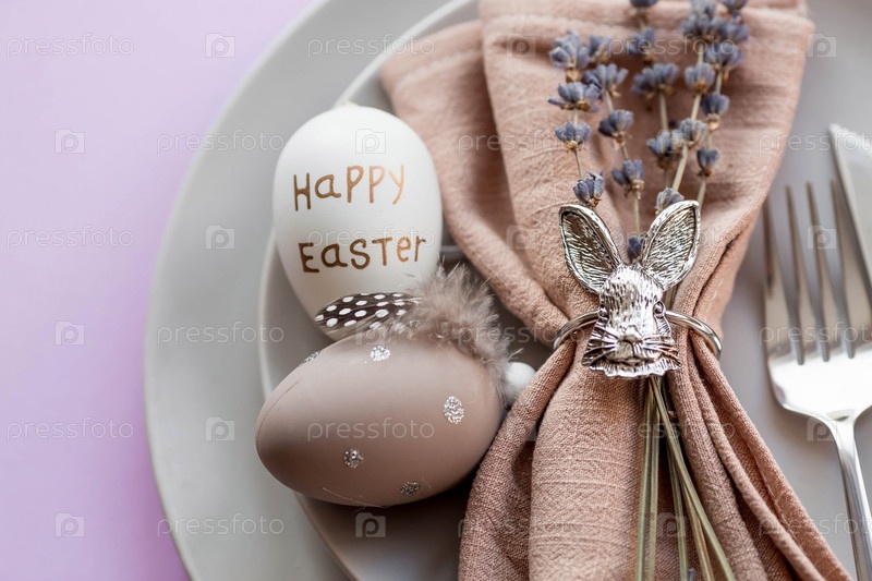 Концепция счастливого, светлого праздника Пасхи. Сервировка стола. Тарелка с кроликом на салфетке, лавандой и пасхальными яйцами на модном фоне 2022 года — это очень красиво. Вид сверху