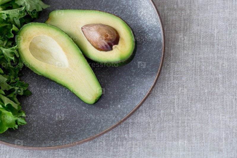 Спелый вкусный авокадо на тарелке на льняной скатерти. Крупный план. Светлый фон. Вегетарианская еда. Здоровый образ жизни