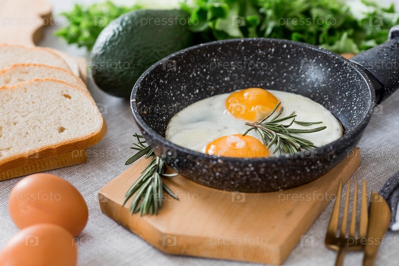 Жареные яйца в сковороде с розмарином, хлебом, яйцами и зеленым салатом на льняной скатерти. Завтрак обед и ужин. Взгляд мягкий, выборочный фокус. Деревенский стиль