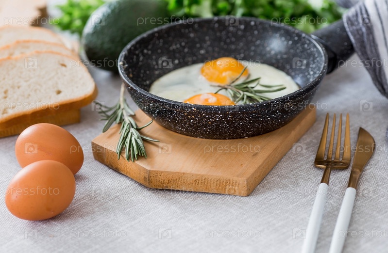 Жареные яйца в сковороде с розмарином, хлебом, яйцами и зеленым салатом на льняной скатерти. Завтрак обед и ужин. Взгляд мягкий, выборочный фокус. Деревенский стиль