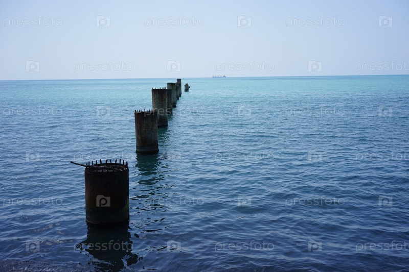 Поддержите старый разрушенный пирс в спокойном синем море