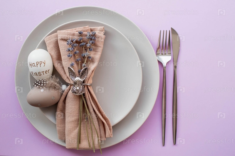 Концепция счастливого, светлого праздника Пасхи. Сервировка стола. Тарелка с кроликом на салфетке, лавандой и пасхальными яйцами на модном фоне 2022 года — это очень красиво. Вид сверху