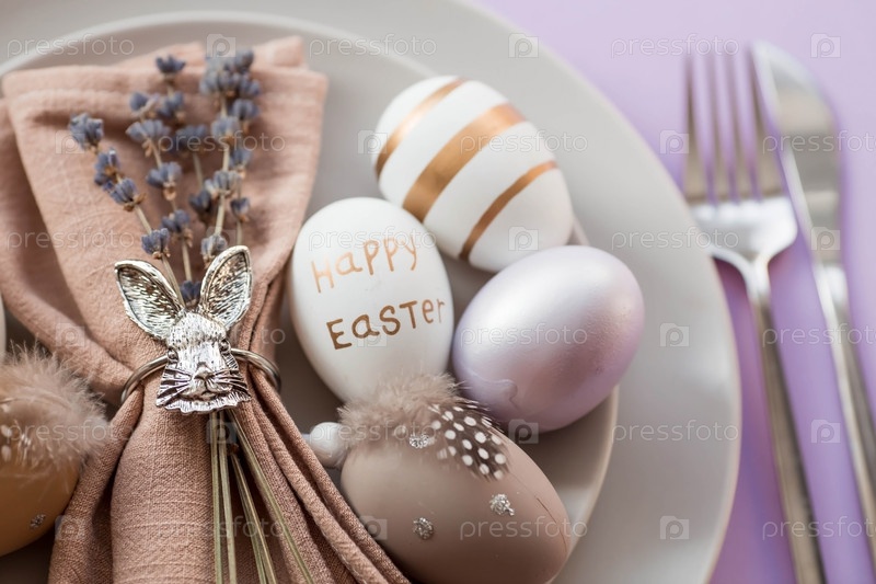 Концепция счастливого, светлого праздника Пасхи. Сервировка стола. Тарелка с кроликом на салфетке, лавандой и пасхальными яйцами на модном фоне 2022 года — это очень красиво. Вид сверху