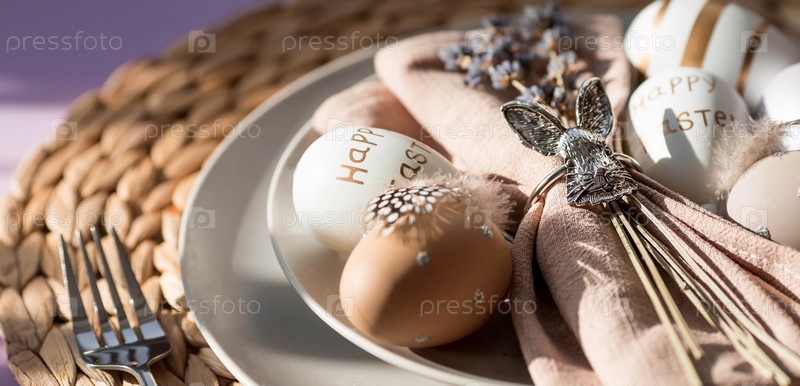 Концепция счастливого, светлого праздника Пасхи. Сервировка стола. Тарелка с кроликом на салфетке, лавандой и пасхальными яйцами на модном фоне 2022 года — это очень красиво. Вид сверху