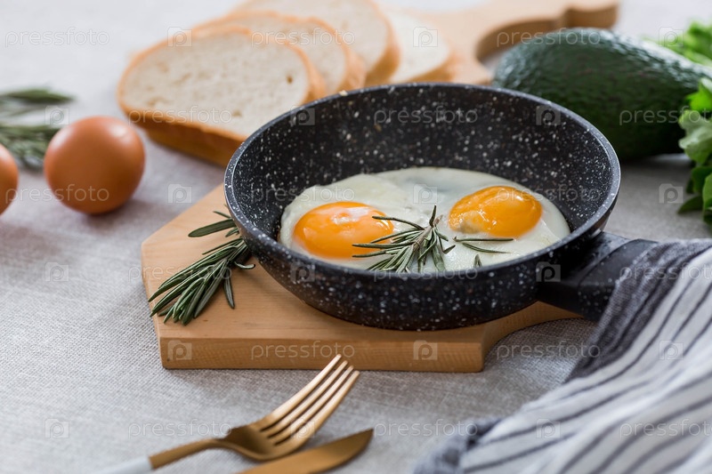 Жареные яйца в сковороде с розмарином, хлебом, яйцами и зеленым салатом на льняной скатерти. Завтрак обед и ужин. Взгляд мягкий, выборочный фокус. Деревенский стиль