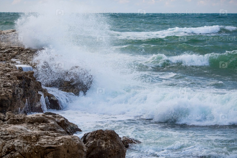 Красивый морской пейзаж. Черноморское побережье. Волны бьются о скалы. Россия, Крым
