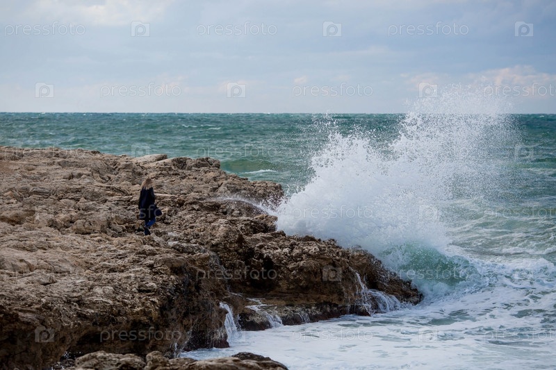 Побережье Крыма. Туристка на краю обрыва. Большие морские волны. Опасность. Накатывает огромная волна. Концепция безопасности, страхование отдыха и туризма