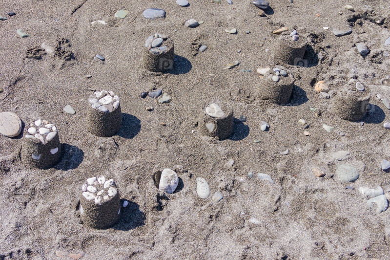 Много песчаных лепешек на пляже. Дети веселятся на каникулах