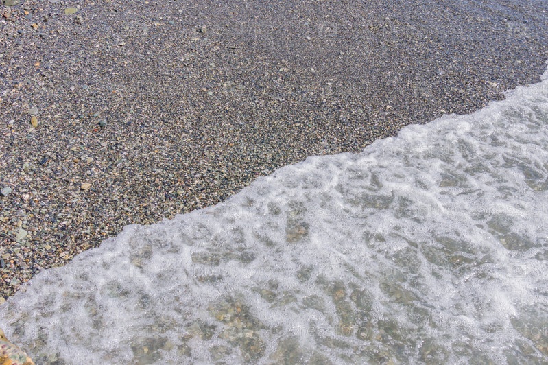 Галечная береговая линия. Морской берег с прозрачной водой и мелкими камнями