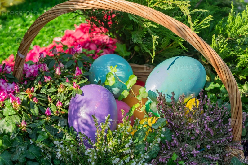 Пасхальное уличное украшение. Плетеная корзина с расписными пасхальными яйцами, тортом и цветами