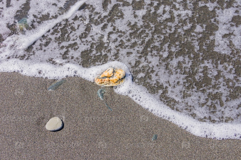Галечная береговая линия. Морской берег с прозрачной водой и мелкими камнями