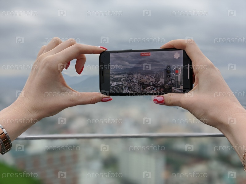 Женщина снимает на видео город Нячанг, провинция Кханьхоа, Вьетнам, на современный смартфон