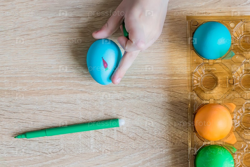 Детская ручная роспись пасхального яйца фломастером. Вид сверху